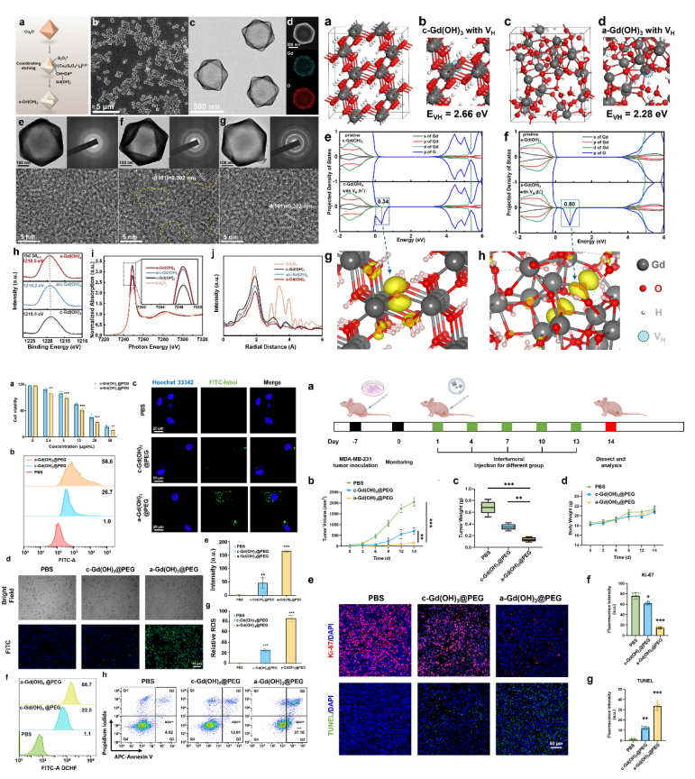 针对以上科学问题,作者基于郭林教授团队于2013年首次提出的“界面限域配位刻蚀”策略(J. Am. Chem. Soc., 2013, 135, 16082),设计并合成了一种非晶笼状Gd(OH)3纳米酶,非晶化显著降低Gd-O配位数并改变4f电子态,增强空穴离域性,使原本惰性的 Gd3+(半满4f7轨道)展现出优异的过氧化物酶(POD)样活性,其Kcat达3.49×10⁴ s-1,高于天然HRP酶的一个数量级。经PEG修饰后,纳米笼在肿瘤微环境(pH ≈ 5.5)中可被特异性激活,通过高效产生活性氧(ROS)抑制肿瘤生长,展现出优异的治疗潜力,为稀土纳米材料在生物医学领域的应用拓展提供了新方向。